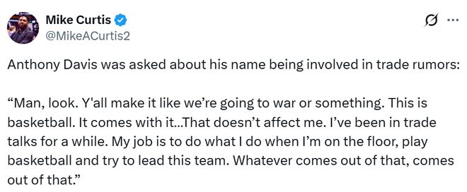 “兄弟,你看,你们把这事儿搞得好像要开战一样,”谈到自己的交易流言,浓眉说,“这只是篮球而已,这类情况本就难以避免。我想每个球员的职业生涯中,都可能卷入过交易讨论、被交易,或是经历过类似的变动。这不会影响到我。”